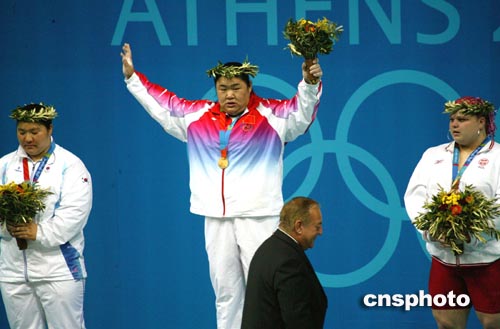 當地時間8月21日,中國選手唐功紅在雅典奧運女子75公斤以上級舉重比賽中,打破挺舉和總成績兩項世界紀錄,奪得該項目的金牌。中新社記者:王瑤