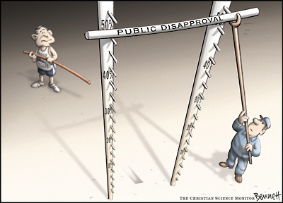 中新網(wǎng)8月22日電 911事件后,美國總統(tǒng)布什的民眾支持率曾達到歷史頂點。但時至今日,布什的民眾不支持率卻是節(jié)節(jié)攀升。分析人士指出,如果民眾的不支持率超過50%,這對于希望蟬聯(lián)總統(tǒng)職位的布什來說,將是一種難以逾越的危機。(來源:基督教科學箴言報)