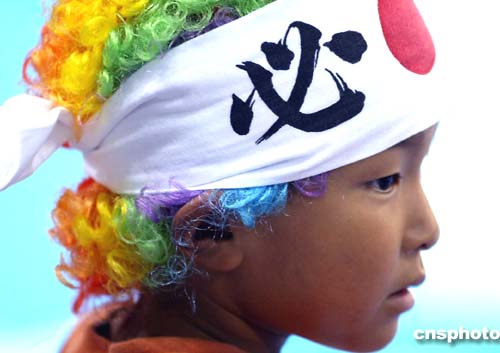 當(dāng)?shù)貢r間8月22日舉行的女子72公斤級摔交比賽場邊,一個打扮引人注目的小孩在為自己國家的運動員們加油。