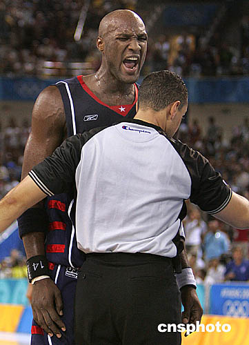 圖為美國籃球隊選手拉馬爾-奧多姆(Lamar Odom)對裁判的判罰相當不滿。