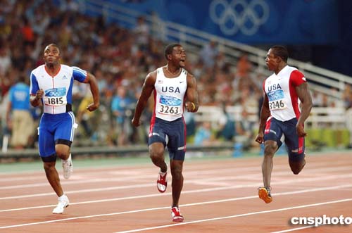 在當地時間22日進行的男子100米半決賽中,美國選手Justin Gatlin和Shawn Crawford一邊比賽,一邊交談。