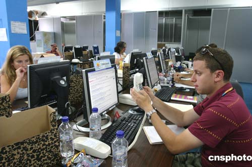 圖為NBC記者在雅典忙著轉播奧運會比賽的場景。
