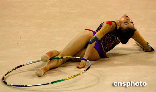 2002年釜山亞運會團體及個人全能冠軍鐘玲,當地時間24日參加藝術體操賽前排練,她將代表中國隊出戰雅典奧運會藝術體操個人全能比賽。中新社記者:王瑤
