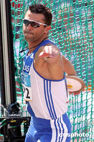圖為希臘選手Prodromos KORKIZOGLOU在男子十項全能鐵餅比賽中奮力一擲顯本色。