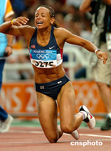 圖為美國選手喬納-海耶斯(Joanna Hayes)在得知自己獲得女子100米跑冠軍后欣喜若狂跪倒在地。
