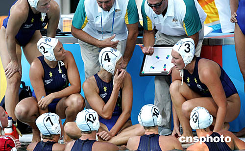 圖為在女子手球比賽現場,教練在現場部署戰術。最后希臘隊戰勝澳大利亞隊挺進決賽。