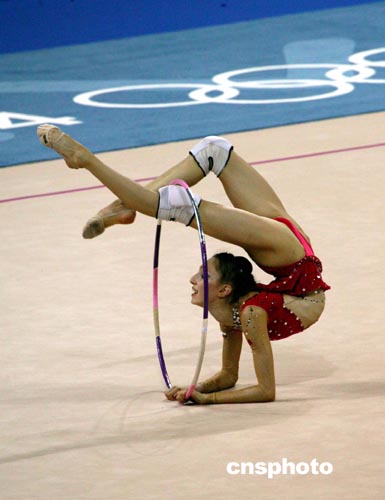 雅典當?shù)貢r間八月二十五日,保加利亞藝術(shù)體操個人全能選手PAISIEVA進行奧運會賽前排練。中新社記者:王瑤