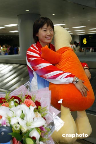8月26日,北京首都國際機(jī)場又迎來一批載譽(yù)歸來的奧運(yùn)健兒,包括羽毛球、乒乓球、游泳、體操、舉重等200多名選手,他們受到英雄般的歡迎。幾乎每個人都被鮮花包圍。圖為在雅典奧運(yùn)會游泳女子100米蛙泳決賽中奪得金牌的羅雪娟被鮮花簇?fù)碇叱鰴C(jī)場。中新社記者:盛佳鵬