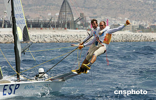 圖為西班牙選手Iker Martinez和Xavier Fernandez奪得帆船49人級冠軍后異常興奮。