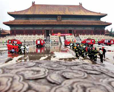 故宮消防中隊出動兩名搶險員,搶救被燒物資,同時府右街消防中隊派出兩副擔架,從殿內(nèi)“火海”中救出兩名“傷員”。花市消防中隊的數(shù)名消防員,在殿內(nèi)架起兩節(jié)梯,從內(nèi)部滅火。
