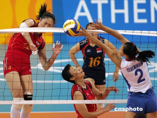 在雅典奧運會女排賽中,中國女排以進攻強、防守好、戰術靈活多變等特點獨領風騷,特別是與俄羅斯隊的決賽中,在先失兩局的情況下,不慌不亂,連扳三局,取得了最終的勝利,再次奪得了奧運會金牌。