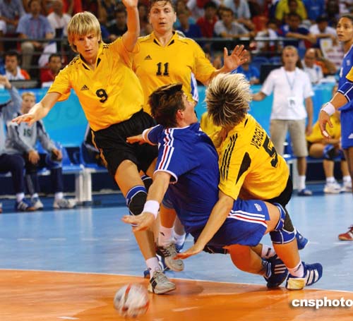 圖為當地時間28日,法國隊與韓國隊在手球比賽場上的爭奪。