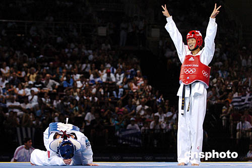 圖為在當地時間8月29日舉行的女子67公斤級的跆拳道比賽中,中國選手陳中擊敗法國選手為中國隊奪得第32枚金牌。