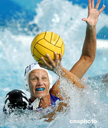 圖為在水球比賽中,澳大利亞選手Naomi Castle防守美國選手Amber Stachowski的鏡頭。