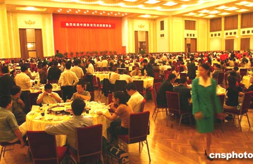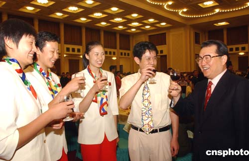 九月二日晚,中共中央辦公廳、國務(wù)院辦公廳在北京人民大會(huì)堂宴會(huì)廳舉行招待會(huì),歡迎載譽(yù)歸來的第28屆奧運(yùn)會(huì)中國體育代表團(tuán)。中共中央政治局常委、國家副主席曾慶紅向獲得奧運(yùn)冠軍的中國女排祝酒。中新社記者:武仲林