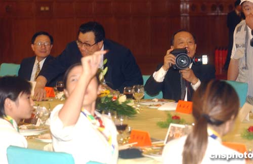 外交部部長李肇星興之所至,借來記者的相機(jī)為奧運(yùn)健兒留下精彩瞬間。中新社記者:武仲林
