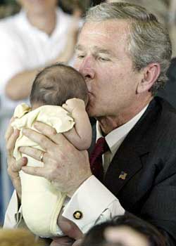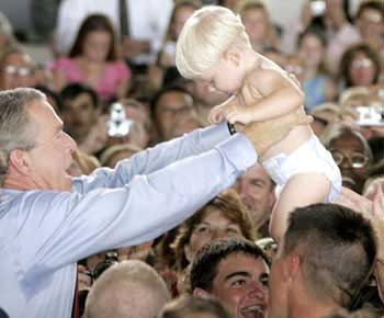中新網9月5日電 據英國媒體報道,四年一度的美國總統大選是美國政治活動中最重要的節目。不論是共和黨,還是民主黨的總統候選人都會想盡一切辦法在選民面前展示自己的良好形象和領導能力。對于他們來說,選民們的“可愛貝貝”是表現其親和力的重要工具。以上就是媒體捕捉到的布什總統在競選活動中拿“可愛貝貝”作秀的精彩鏡頭。(固山)
