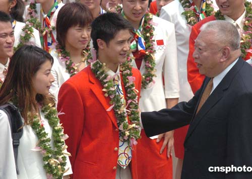 由袁偉民任團(tuán)長的中國奧運(yùn)金牌代表團(tuán)一行共有68人,包括了在雅典榮獲32枚金牌的全部運(yùn)動(dòng)員和許海峰、陳忠和等7位著名教練。
