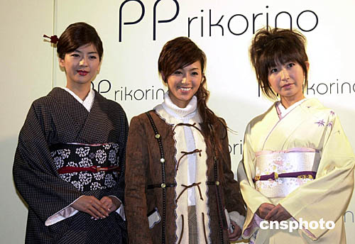 日本知名藝人酒井法子(中)等七日在東京舉行的一個秋冬新款時(shí)尚服飾展示會上,傾情演出造勢。作者:王健