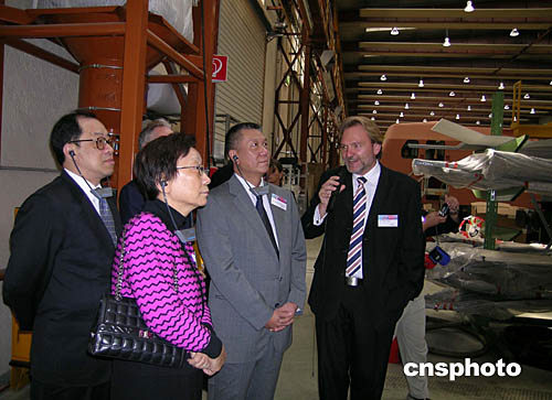 當地時間十三日下午﹐何厚鏵來到德國慕尼黑著名的西門子公司參觀訪問﹐在生產機車的工廠﹐何厚鏵等人聽取公司負責人介紹。作者:孫兆震