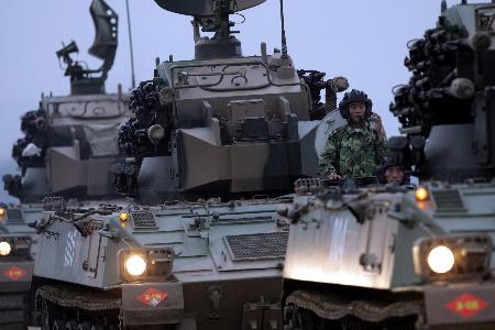 中國人民解放軍濟南軍區(qū)某部25日在位于河南的確山訓練基地進行了代號為“鐵拳-2004”的加強機械化步兵師級實兵實彈演習。