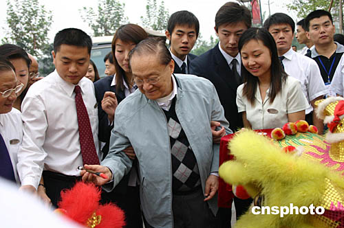 香港文壇巨擘金庸九月二十七日下午來到成都芙蓉古城參觀民居民風,這是他在芙蓉古城大門為迎接的醒獅點睛。作者:魯彥