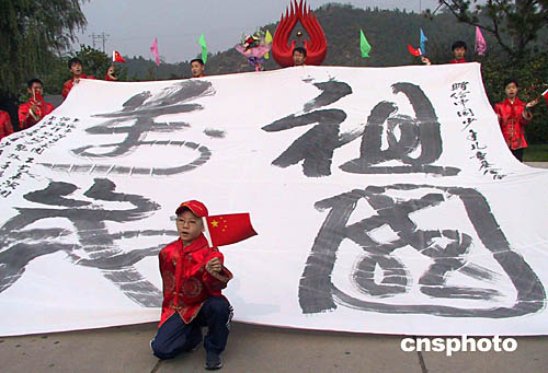在中華人民共和國成立五十五周年到來之際,一位名叫陳鼎新的上海十歲學童(前),九月二十九日在北京八達嶺長城把自己書寫的一幅巨筆書法作品捐獻給“中國少年兒童基金會”,以表達對祖國的祝福。作者:宗金柱