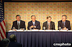 美國司法部長阿什克羅夫特、商務部長埃文斯、貿易代表佐立克、國土安全部副部長哈欽森(從左到右),十月四日在華盛頓聯合宣布啟動“瞄準有組織侵權策略”行動,將采取更加嚴厲的措施打擊侵權盜版。埃文斯稱,知識產權保護狀況被美國列為其承認中國市場經濟地位需要討論的重要問題之一。作者:余東暉