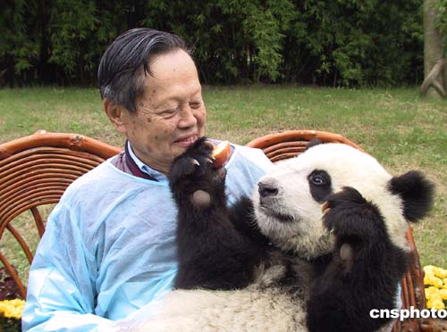 10月14日上午,世界著名物理學家、諾貝爾獎獲得者楊振寧抵成都大熊貓繁育研究基地參觀,并與憨態可掬的大熊貓合影留念。作者:張華