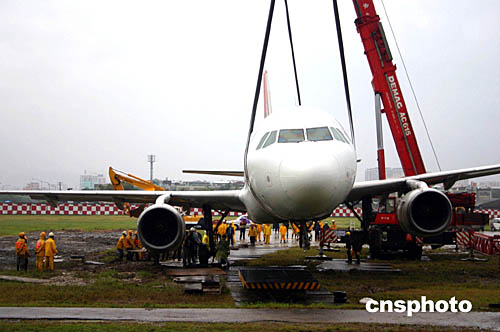 此間電視臺(tái)報(bào)道,這架載有九十人的A-320飛機(jī)原計(jì)劃晚八點(diǎn)在松山機(jī)場(chǎng)降落,由于天雨跑道濕滑,加上側(cè)風(fēng),出現(xiàn)失控,險(xiǎn)些撞到機(jī)場(chǎng)圍墻。駕駛員緊急左轉(zhuǎn),因而飛機(jī)沖出跑道。從電視畫(huà)面上看,飛機(jī)前輪似有損壞,機(jī)頭微朝下。