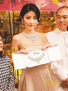 中新網10月24日電 陳慧琳昨日以米色低胸短裙,并配上價值百多萬的名貴頸練和戒指,擔任某珠寶店新店開幕的剪彩嘉賓,大會更送上一套價值88萬的鉆飾作為禮物。而Kelly剪彩完后,更為店內的一座“金雞”揭幕,提早迎接雞年的來臨。