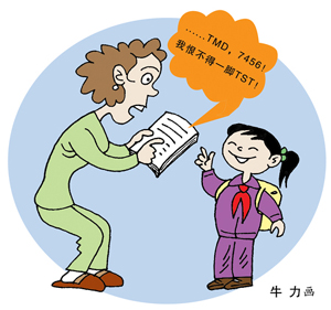 家住天津市和平區(qū)的許女士無意間發(fā)現(xiàn)女兒的日記中有這樣的文字:“……沒想到我最要好的朋友竟欺騙我,TMD(他媽的),7456(氣死我了),我恨不得一腳TST(踢死她)。”許女士看后不知所云,直到女兒一番解釋她才明白過來。許女士無奈地對記者說:“這是什么話呀,日記本成了密碼本,根本看不明白!看來我和孩子之間已經(jīng)有了‘網(wǎng)絡(luò)溝’。”