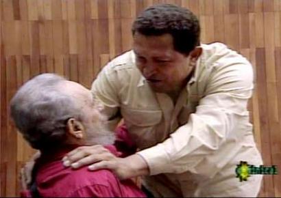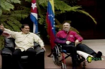 新聞報道稱,卡斯特羅與查維斯在上星期六晚上舉行了八個小時的會談。電視臺的畫面顯示,卡斯特坐在輪椅上,他的腿打了石膏,胳膊也用懸?guī)У踔?/p>