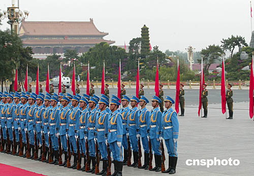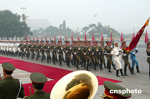 圖為九月底解放軍三軍儀仗隊在北京人民大會堂東門外廣場在執行一項外事檢閱任務。