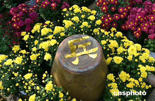 11月12日,臺北菊展在當年蔣介石的士林官邸開幕。圖為門前的“棋奕菊間”花區,各色菊花間擺放著中國象棋棋子,創意十足。中新社記者:董會峰