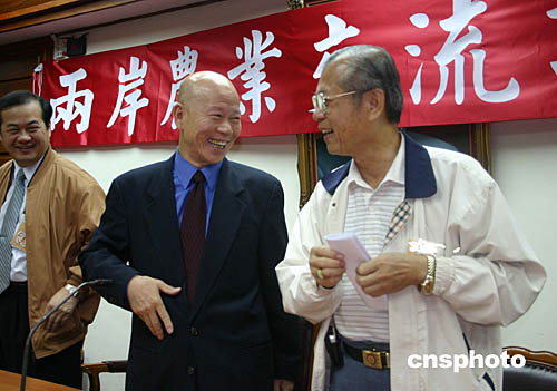 兩岸農業交流訪問團返回臺灣后于13日上午舉行記者會,公布五大訪問成果。圖為團長許信良(中)在記者會上開懷而笑。中新社記者:董會峰