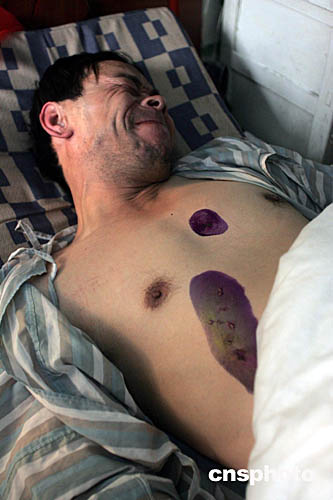 十一月二十二日,在“11.20”河北省邢臺市沙河礦難中受傷的陜西籍礦工李國友在醫院接受治療。礦難發生后他在礦下堅持了二十多個小時,并協助挽救了十七名礦工的生命。
