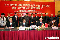 十一月二十三日,上海西門子燃氣輪機部件有限公司成立簽約儀式在滬舉行。該公司是由西門子公司和上海電氣集團股份有限公司共同投資五千五百萬歐元合作成立的。圖為簽約儀式現場。作者:湯彥俊