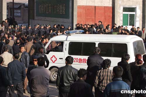 十一月二十九日下午,救護車在發生瓦斯爆炸事故的陜西銅川礦務局陳家山煤礦外待命,隨時準備救治至今下落不明的礦工。作者:任晨鳴