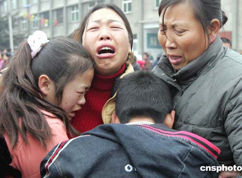 剛剛趕到陳家山煤礦的陜西富平籍礦工王喜財的妻子嚴慧(中)和兒子抱頭痛哭。作者:任晨鳴