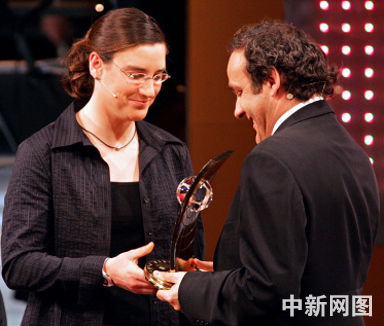 普拉蒂尼為2004年度世界足球小姐普林茨(圖左)頒獎