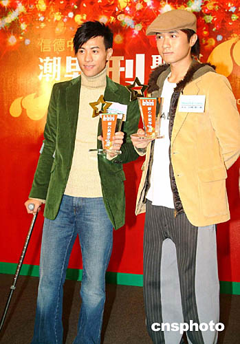 踏入年終,香港樂壇頒獎禮一觸即發,眾歌星紛紛外出宣傳拉票。12月23日,信德中心邀請被喻為樂壇『新四天天王』的其中兩位大熱型男古巨基、梁漢文出席慈善活動。大會特別頒發『2004年度樂壇愛心型男金獎』的獎座感謝古巨基[右]、梁漢文的鼎力支持。作者:洪少葵