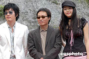 韓國電影《野蠻師姐》女主角全智賢、男主角張赫及導演郭在容(中)5月27日在香港元朗流浮山警署為電影宣傳造勢。作者:鄧慶樂