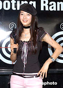 韓國電影《野蠻師姐》女主角全智賢5月27日在香港元朗流浮山警署為電影宣傳造勢,手持左輪手槍一展“師姐”風范。作者:鄧慶樂