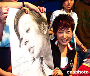 五月二十九日下午,孫悅在北京王府井為新專輯《她和她們》進行現場簽售,一歌迷送上自己創作的孫悅素描畫,以示支持。作者:韓藝冰