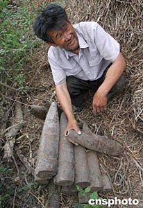 距離發現大量侵華日軍遺留化學武器的齊齊哈爾市昂昂溪區頭站村僅三公里的三間房村,六月十九日又新發現十七枚炮彈。這些炮彈是該村村民賈衍教于二十余年前找到的,并一直放在自家屋后草房中。經專家初步鑒定,這些炮彈與頭站村的日軍遺留毒氣彈相同。作者:寧秀英