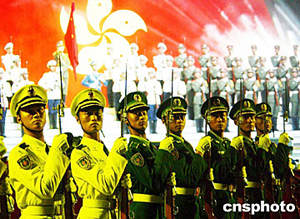 為慶祝香港回歸祖國(guó)七周年,中國(guó)人民解放軍四百人組成的藝術(shù)團(tuán)六月二十三日在香港紅磡體育館舉行首場(chǎng)盛大演出。圖為駐港部隊(duì)三軍儀仗隊(duì)參加演出。中新社記者:錢(qián)興強(qiáng)