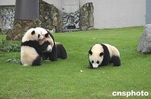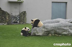 六月下旬,世界第一對由母體同時撫育長大的大熊貓“隆浜”和“秋浜”與母親“梅梅”在日本和歌山白浜野生動物園草坪上玩耍。這對雙胞胎二零零三年九月八日出生在日本,“隆浜”現在體重已達十七點九公斤,“秋浜”達十九點三五公斤,體態嬌憨,十分惹人喜愛。一般說來,熊貓產下雙胞胎,由于顧此失彼,很難由母體成功地撫育。作者:肖龍聯