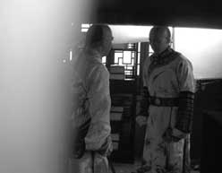 下午5時,拍攝完《紀》劇當天戲后,張國立又穿著皇袍到《少》劇片場和張默表演了一場父子對手戲。他們走進靠近記者所在側(cè)門的一間小屋,記者側(cè)耳聆聽了他們父子對臺詞的過程。據(jù)悉,張默扮演雍正皇帝兒子弘晝,而張國立則扮演皇帝。工作人員叫張默進場不久,只聽見張默說:“兒臣救駕來遲,請皇阿瑪贖罪。”而張國立則立即指點:“不慌,你再來一遍,要急匆匆進來。”隨后張默又沖進小屋重復(fù)了一遍臺詞,張國立叫了一聲“平身”,馬上又叮囑張默下跪時“眼神還要低一點”。很快兩人又重復(fù)了一遍臺詞,最后大約拍攝了兩條,這場戲就過了。