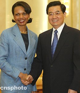 中新社北京七月九日電(記者齊彬)中國國家主席胡錦濤今天在會見到訪的美國總統(tǒng)國家安全事務(wù)助理賴斯時表示,希望美方恪守承諾,尤其要將承諾轉(zhuǎn)化為實實在在的行動,不要向臺灣當(dāng)局發(fā)出錯誤信號,以免損害臺海地區(qū)的和平與穩(wěn)定。